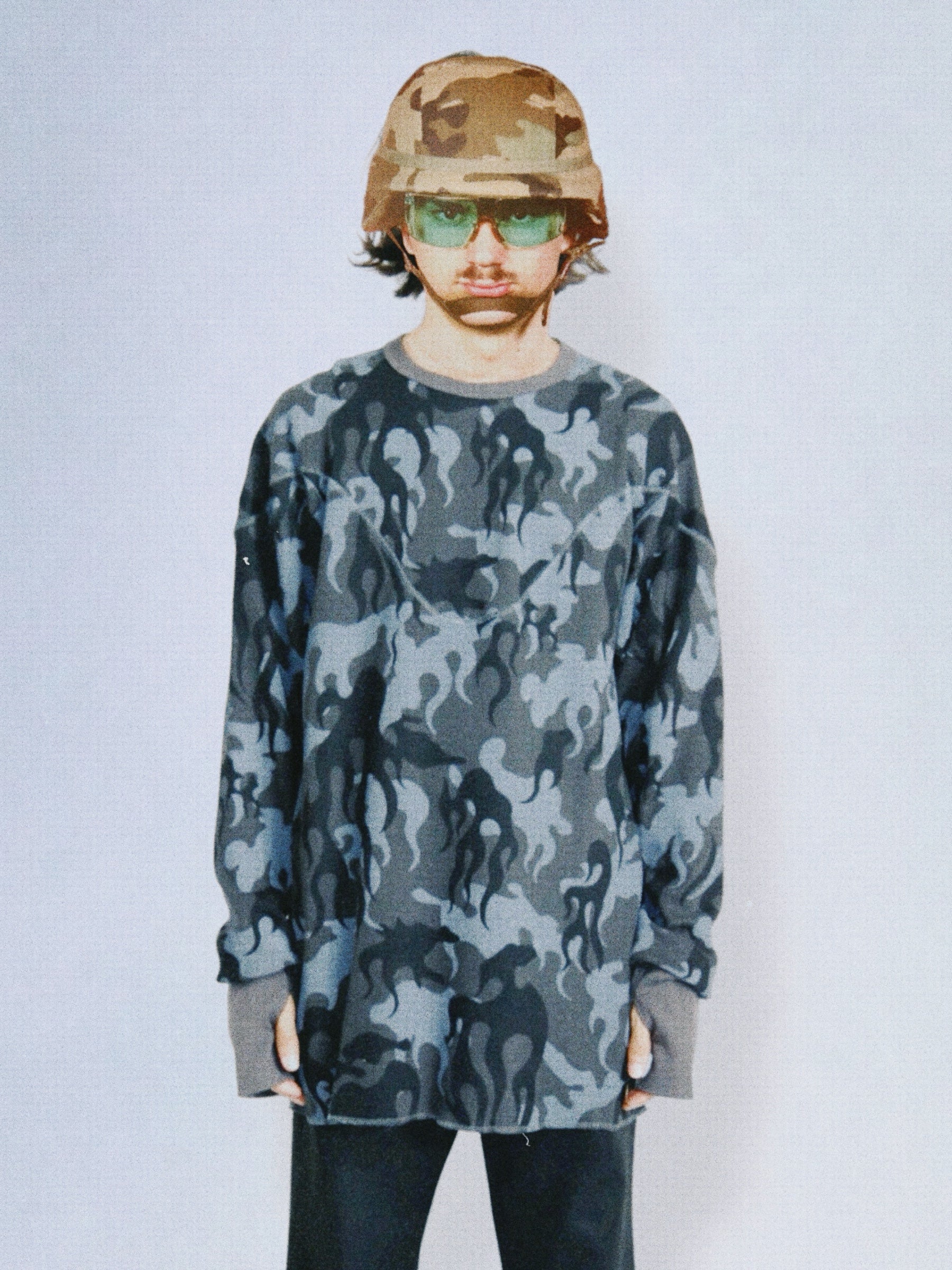 We developed a thermal fabric using our original camouflage textile inspired by a fire pattern. The "Off" color is one-washed, while the "Shadow" color features a post-dye finish. Designed with extended ribbed cuffs and finger holes, this piece is well-suited for layered styling during the autumn and winter seasons.
