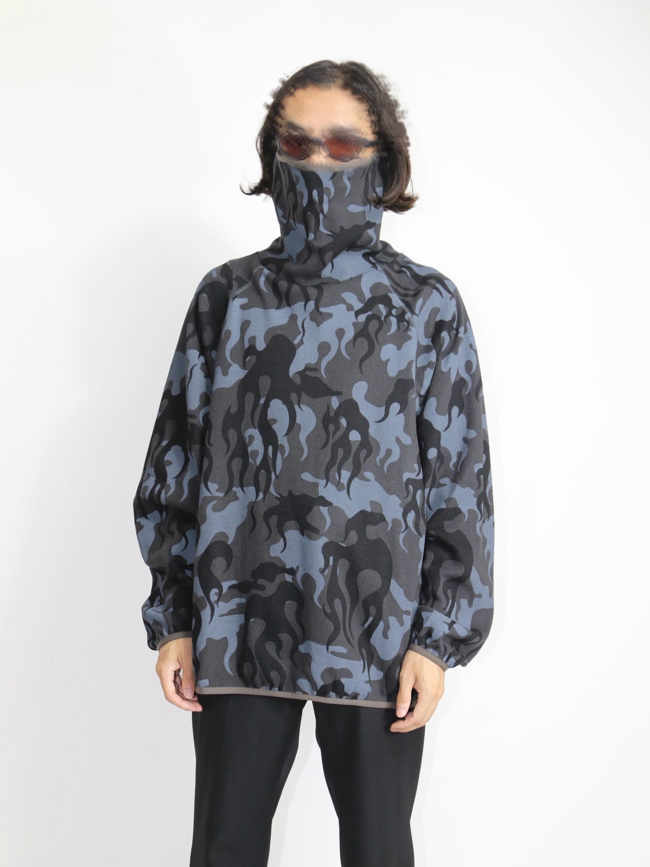 ファイヤーパターンをモチーフにオリジナルカモのテキスタイルでサーマル生地を作りました。Offはワンウォッシュ。Shadowは後染めの仕様です。アウトドアギアをモチーフにタートルネック部分にはイヤーフラップを設け商品名の通りマスクとしても着用して頂けます。