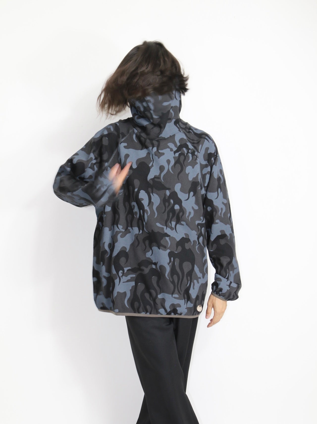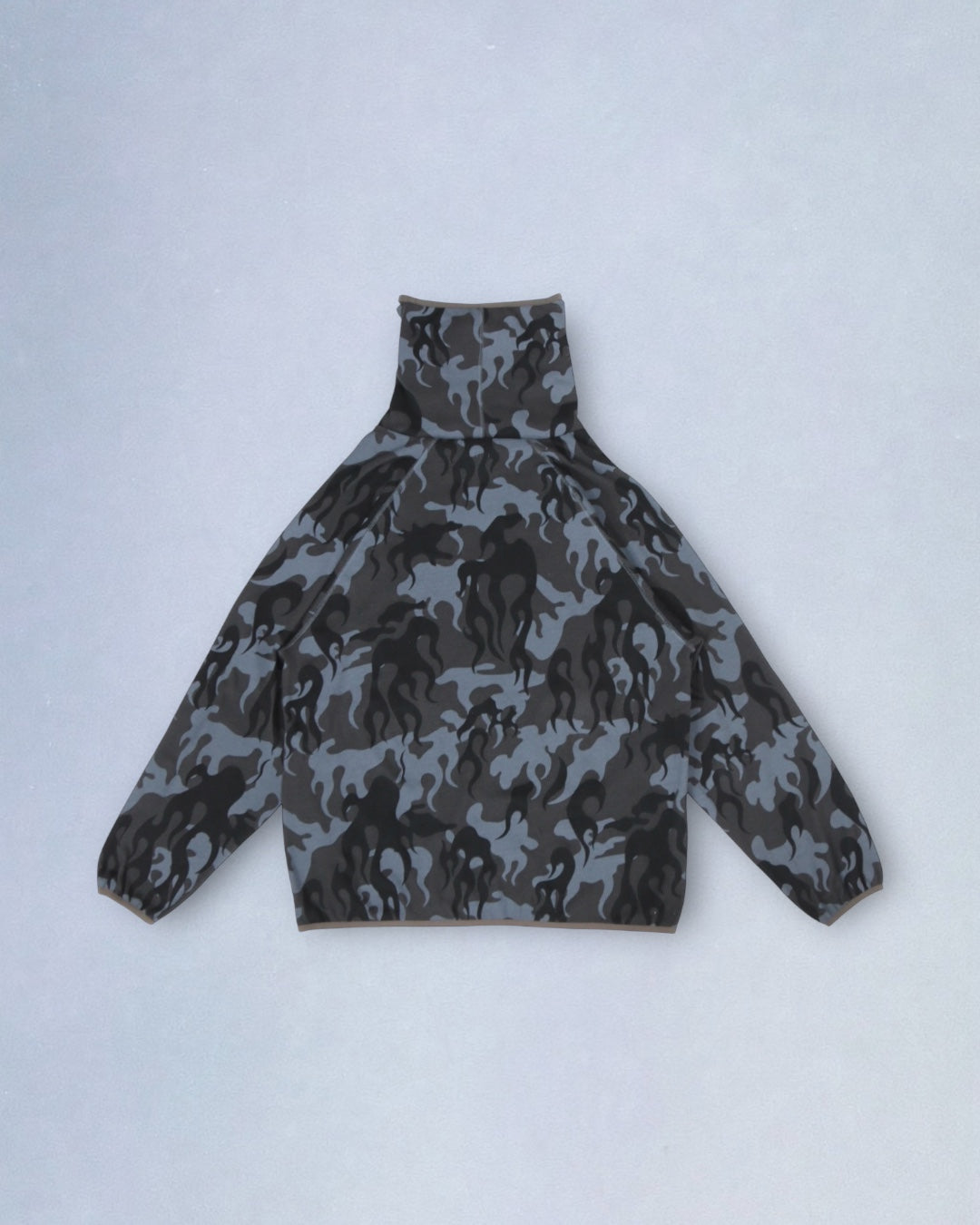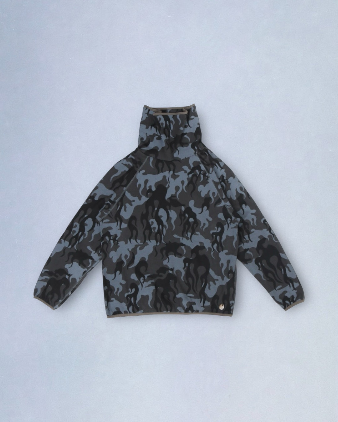 We developed a thermal fabric using our original camouflage textile inspired by a fire pattern. The "Off" color is one-washed, while the "Shadow" color features a post-dye finish. Inspired by outdoor gear, the turtleneck includes ear flaps and can also be worn as a mask, just as the product name suggests.