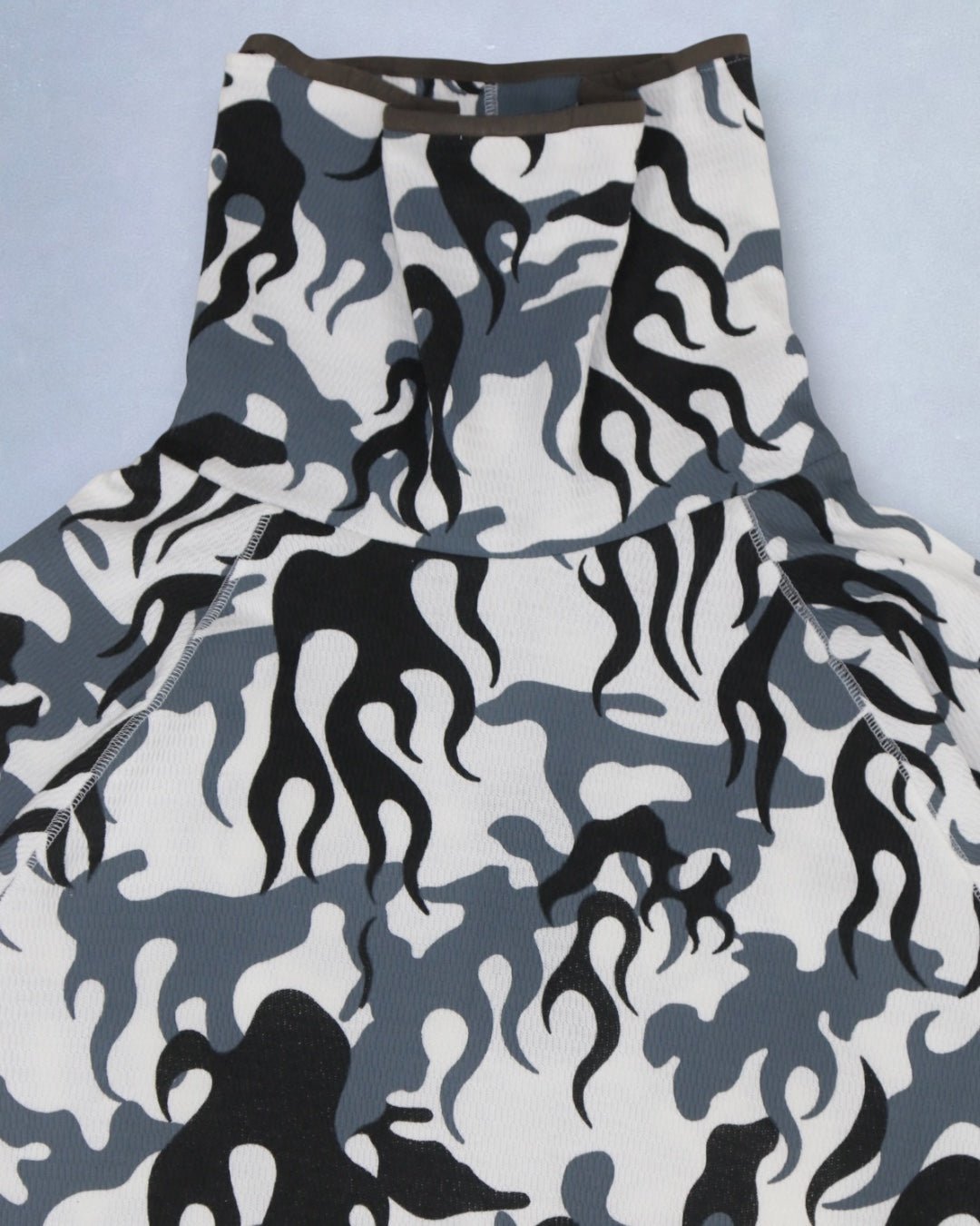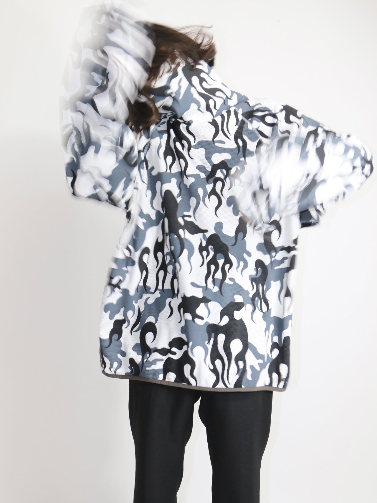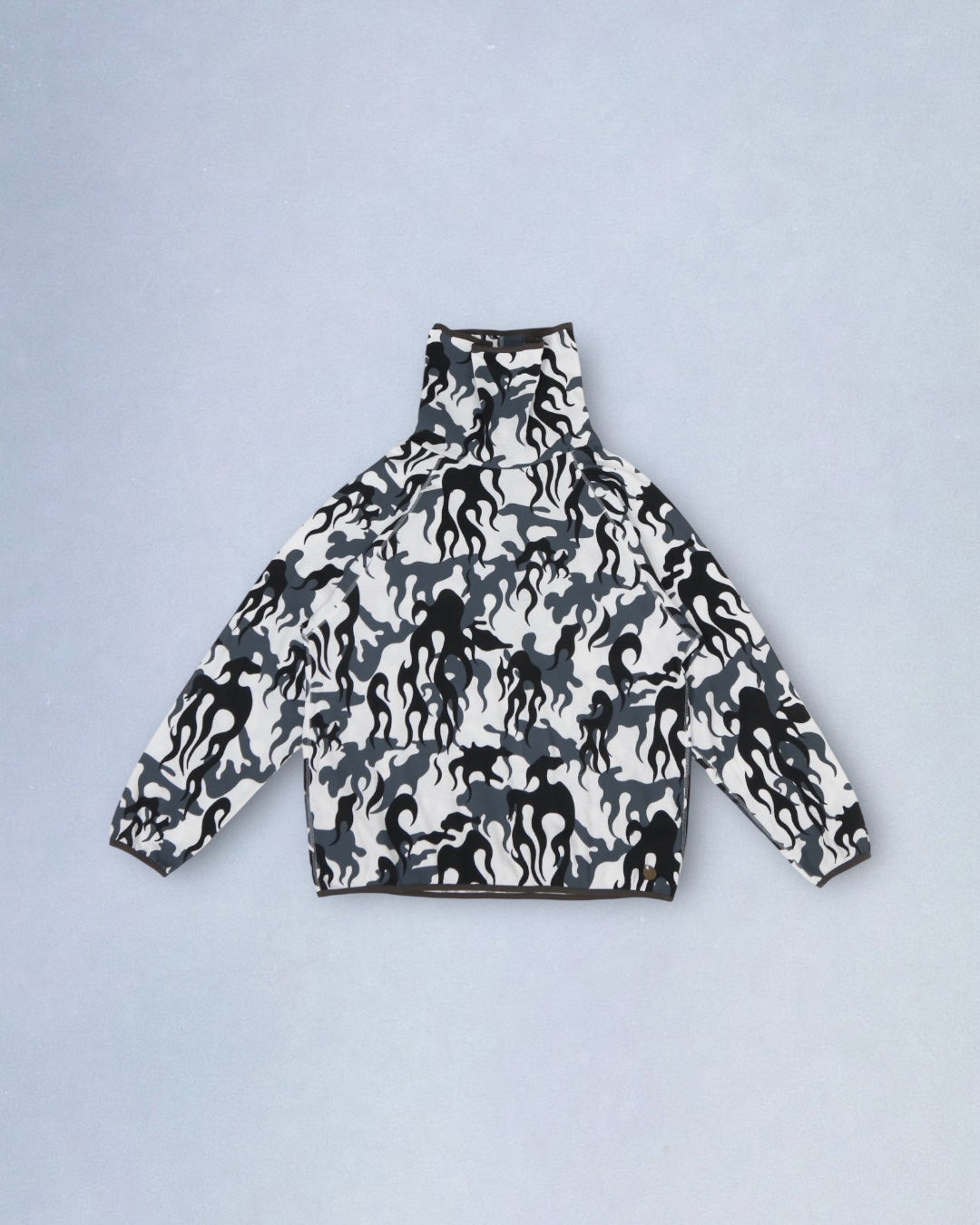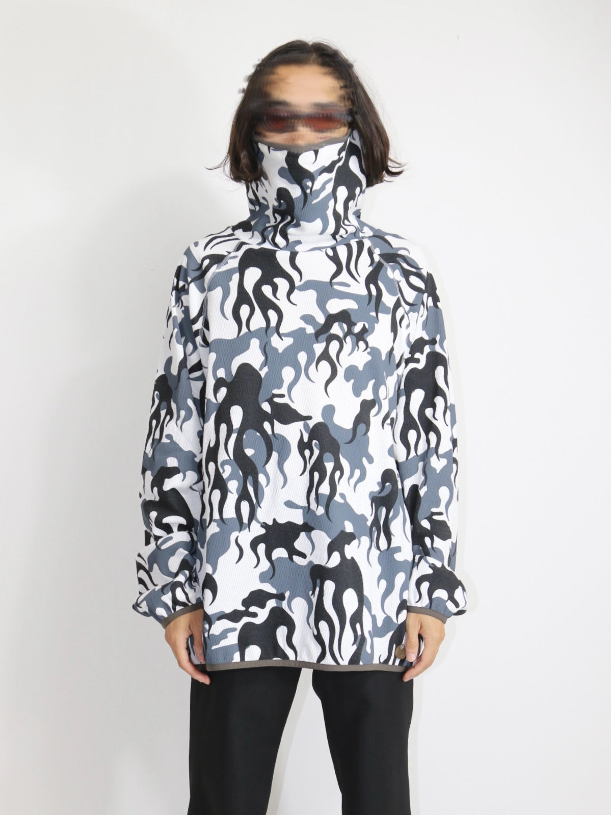 We developed a thermal fabric using our original camouflage textile inspired by a fire pattern. The "Off" color is one-washed, while the "Shadow" color features a post-dye finish. Inspired by outdoor gear, the turtleneck includes ear flaps and can also be worn as a mask, just as the product name suggests.