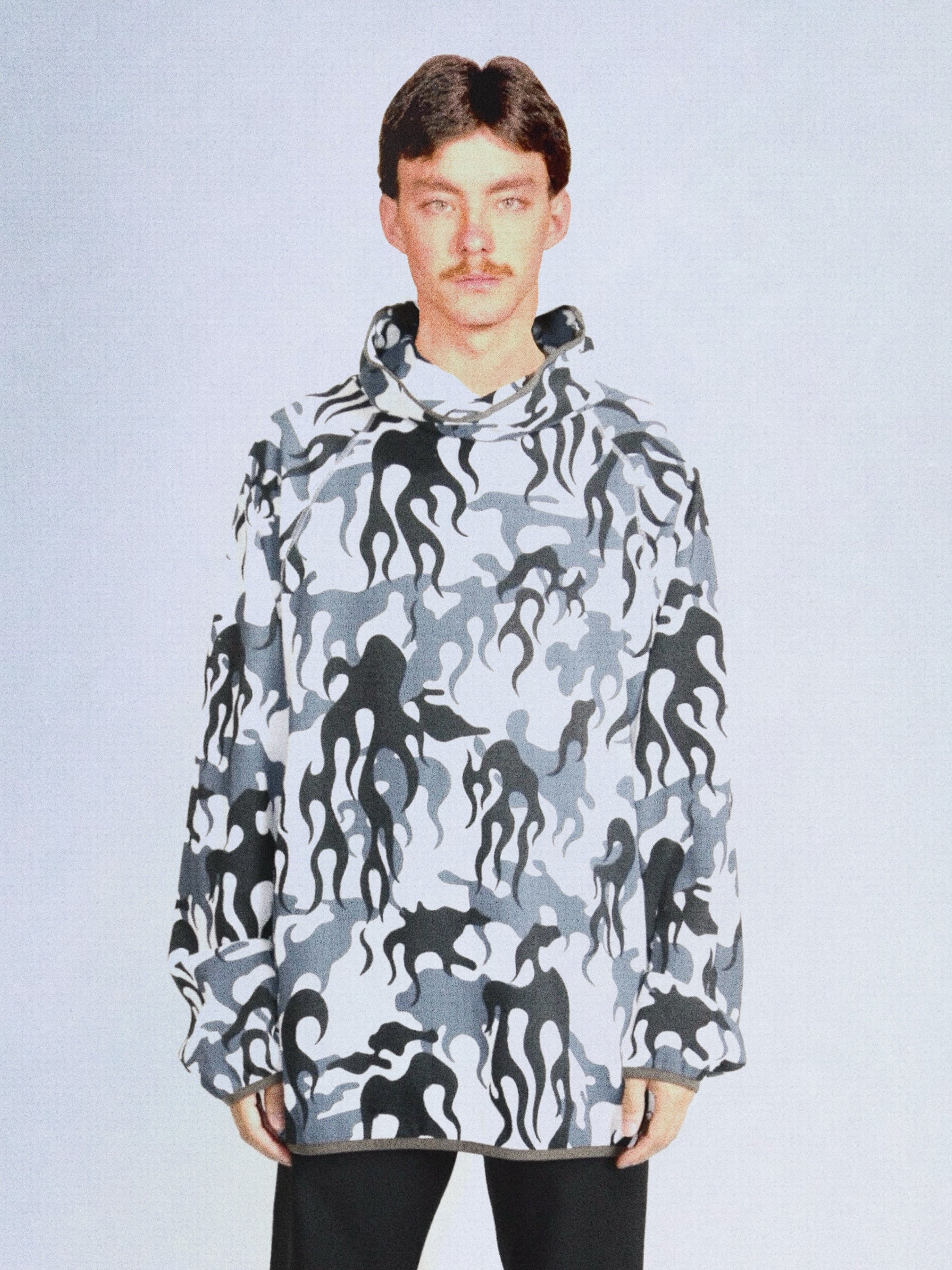 ファイヤーパターンをモチーフにオリジナルカモのテキスタイルでサーマル生地を作りました。Offはワンウォッシュ。Shadowは後染めの仕様です。アウトドアギアをモチーフにタートルネック部分にはイヤーフラップを設け商品名の通りマスクとしても着用して頂けます。